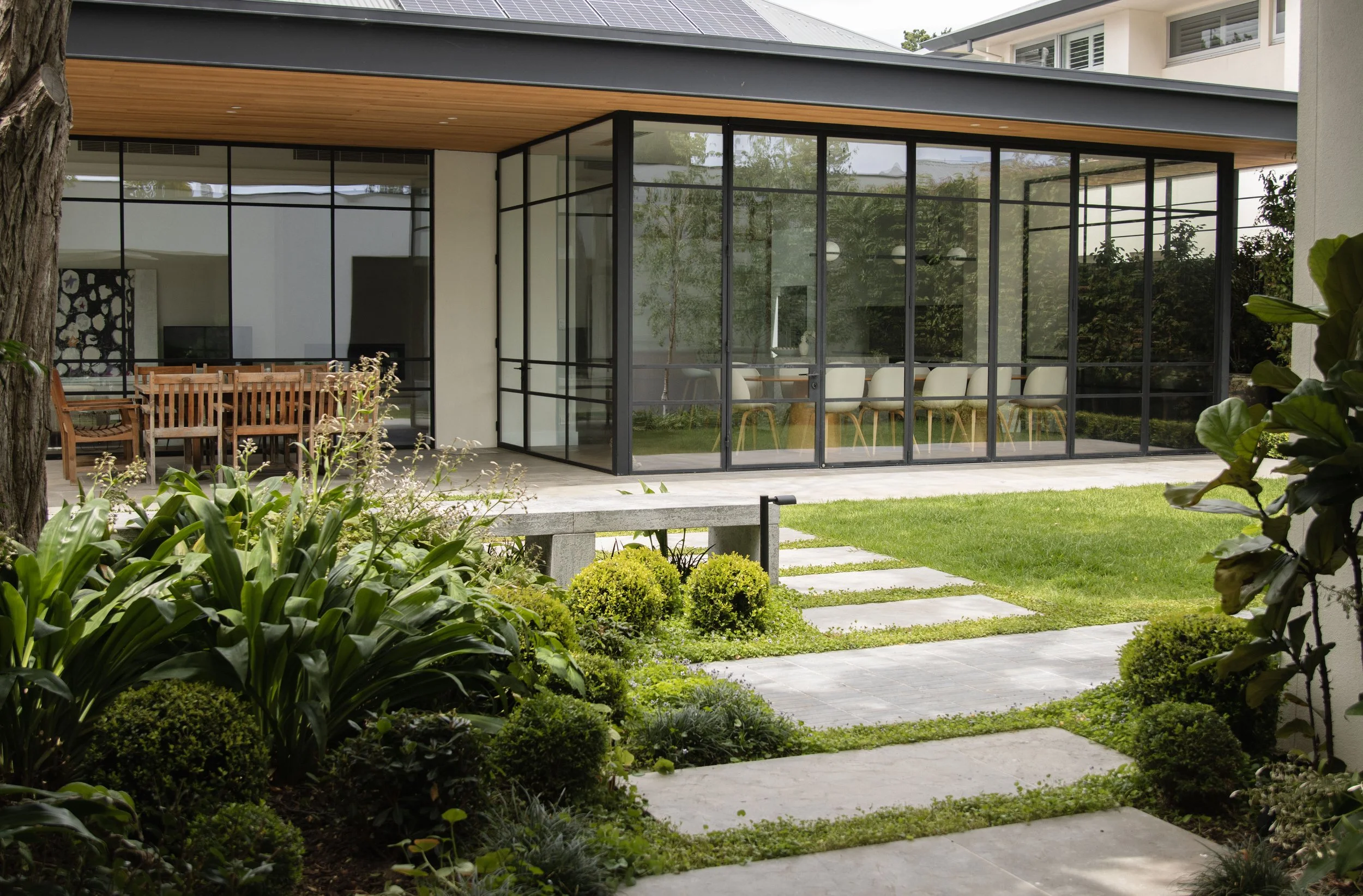 BACK GARDEN: Pleached Weeping Lilypily hedges flank the back garden and help to screen neighbouring properties. The entertainment space is extended by banded paving interplanted with dichondra and a bespoke limestone bench that celebrates the existing Golden Elm. Steppers lead from the house to the garage and to the garden room where the bluestone batten clad paving circle reflects the circular ceiling void and is surround by a lush, green textural garden. A lawn area was also paramount in this dog friendly house!